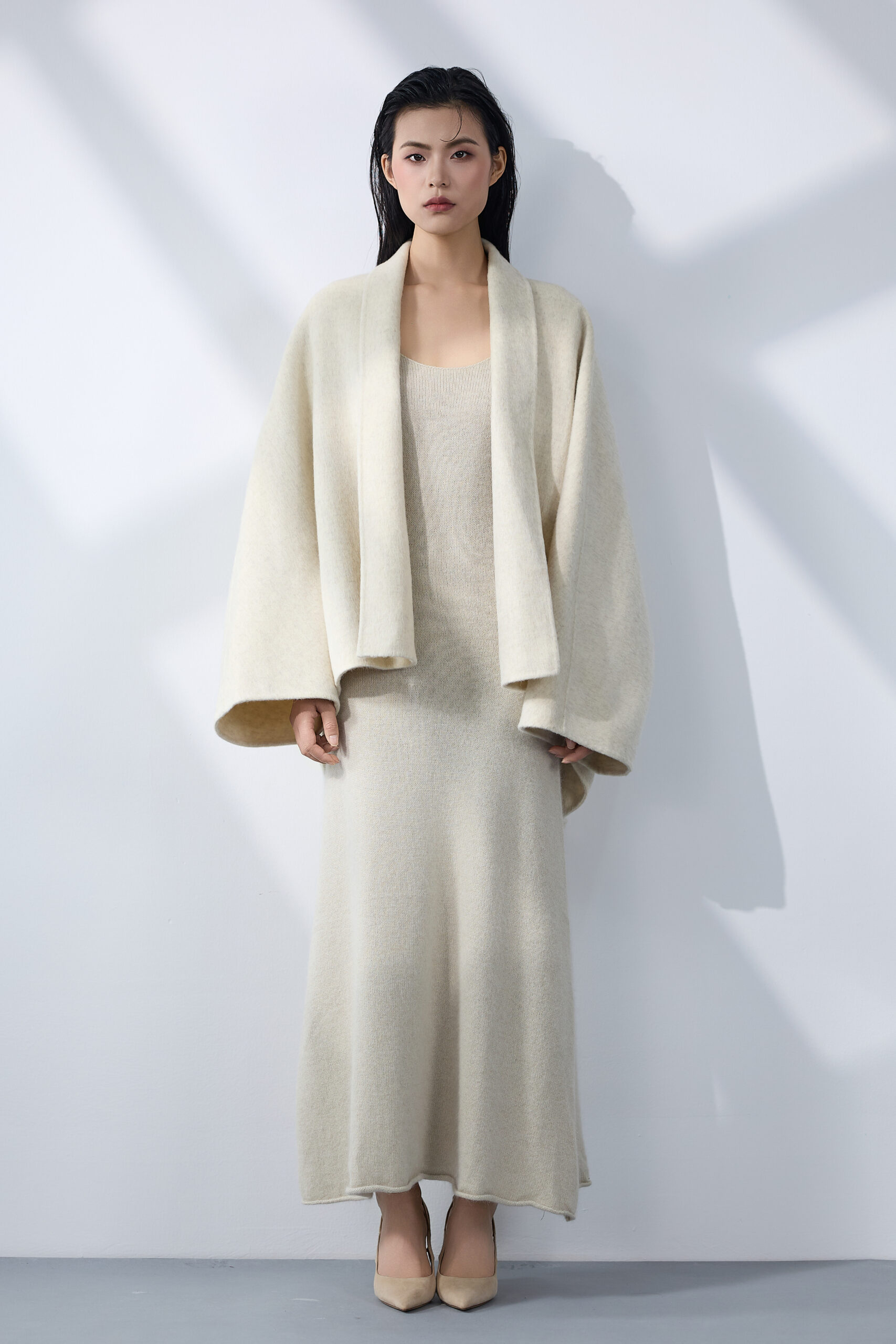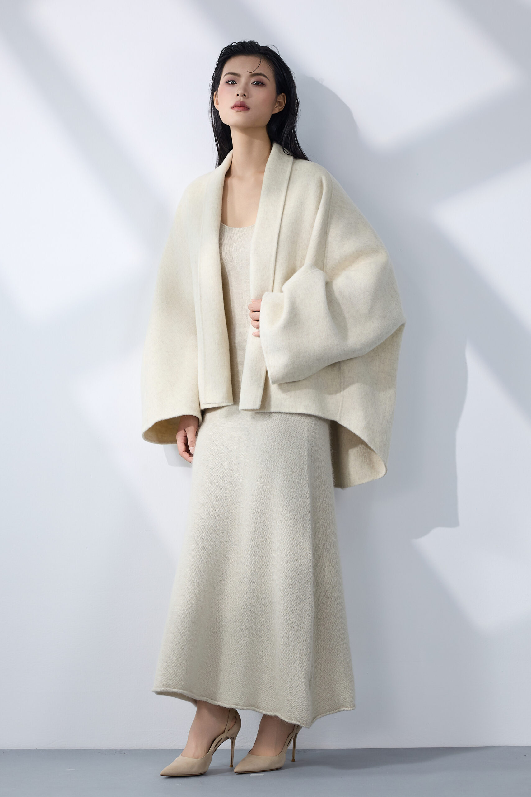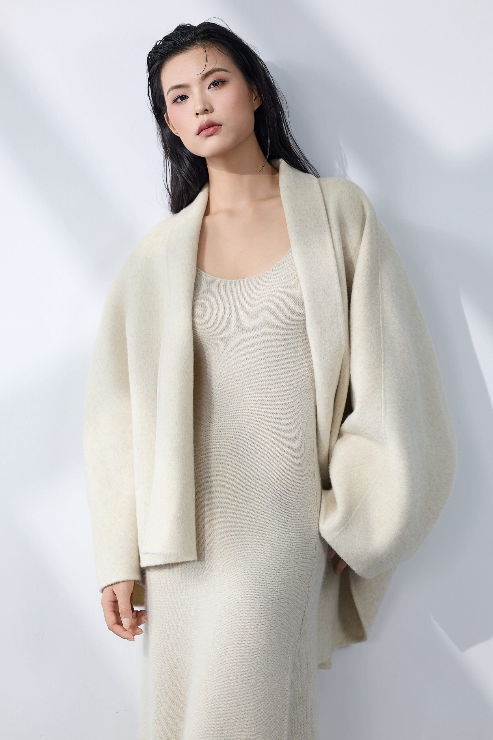 An ivory wool set with fluid, oversized tailoring that evokes warmth and quiet sophistication — a seamless balance of purity and elegance.