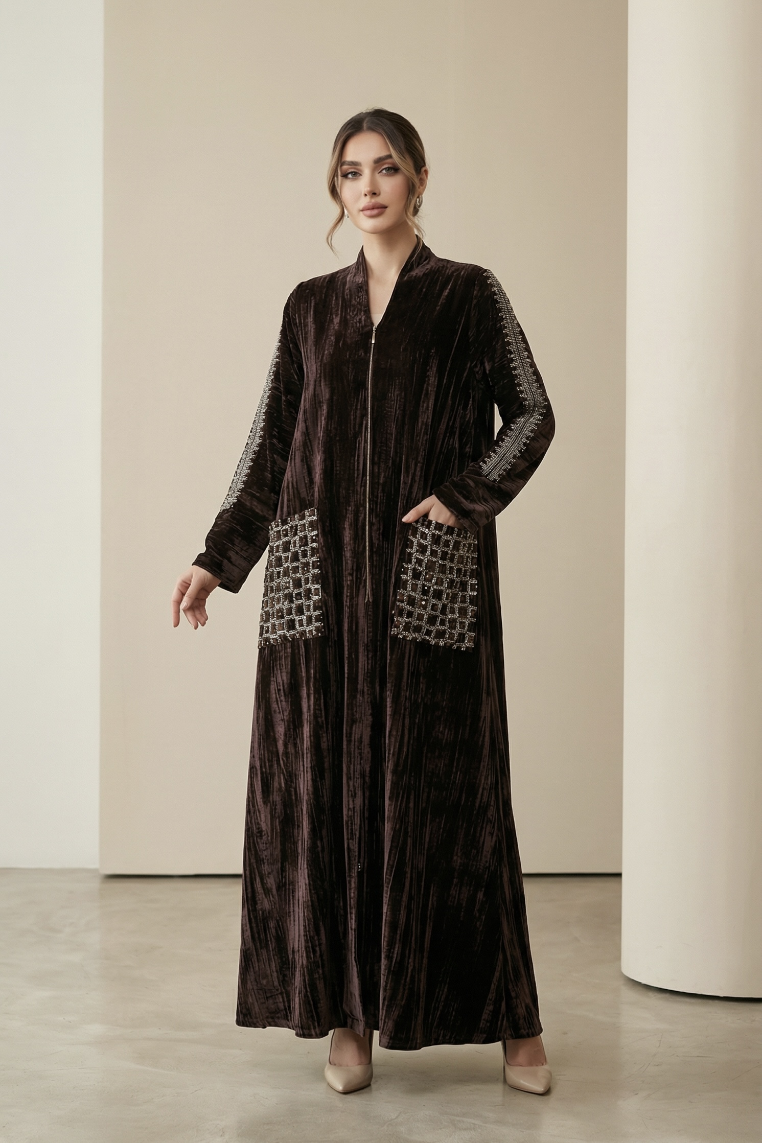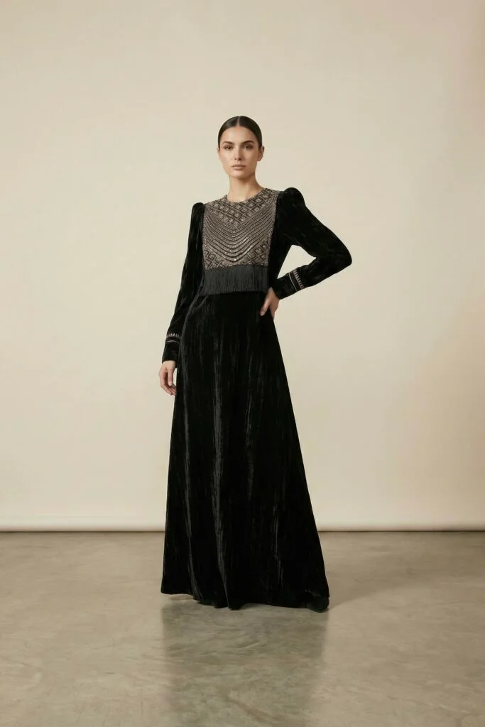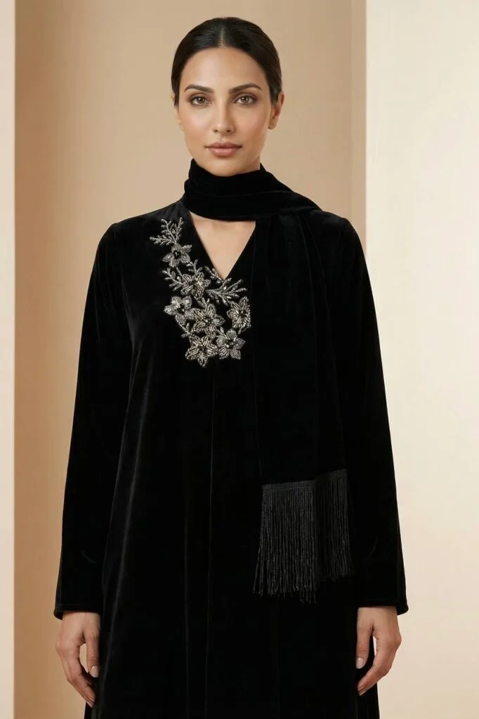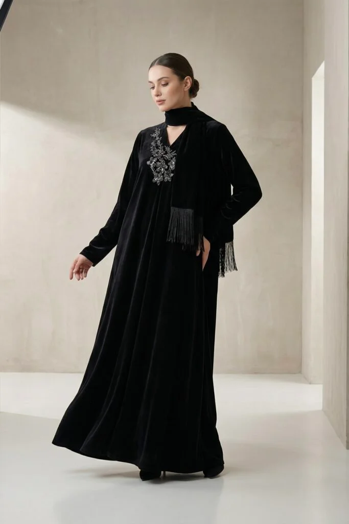 A refined black velvet jalabiya featuring a flowing silhouette, highlighted with delicate silver embroidery at the bodice and an integrated shawl for timeless elegance.