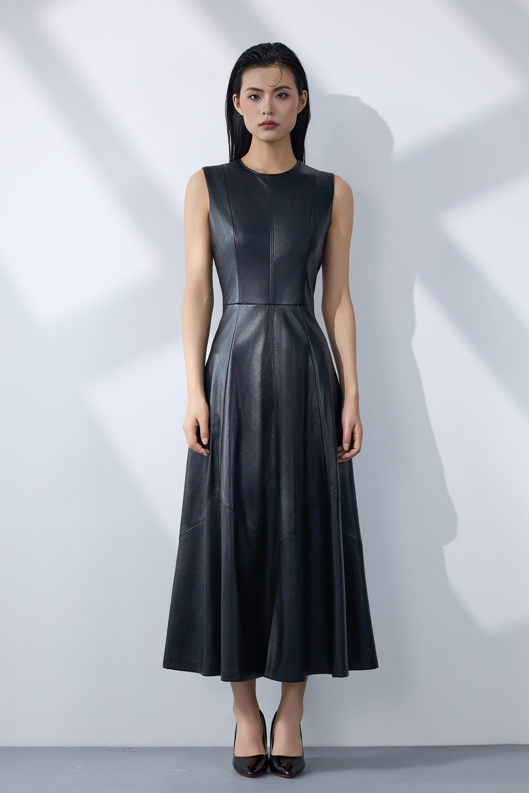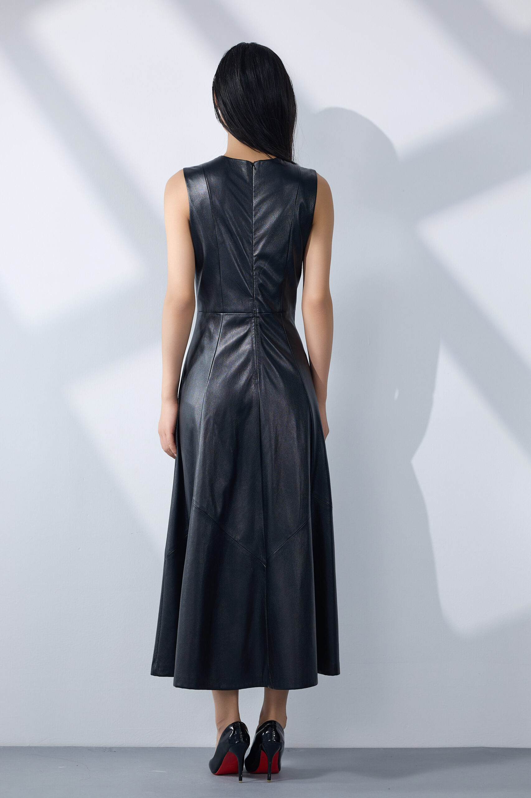 A sleek sleeveless dress crafted from soft leather-touch fabric, blending architectural precision with modern femininity. Its sculpted silhouette and fluid lines evoke effortless power and quiet luxury.