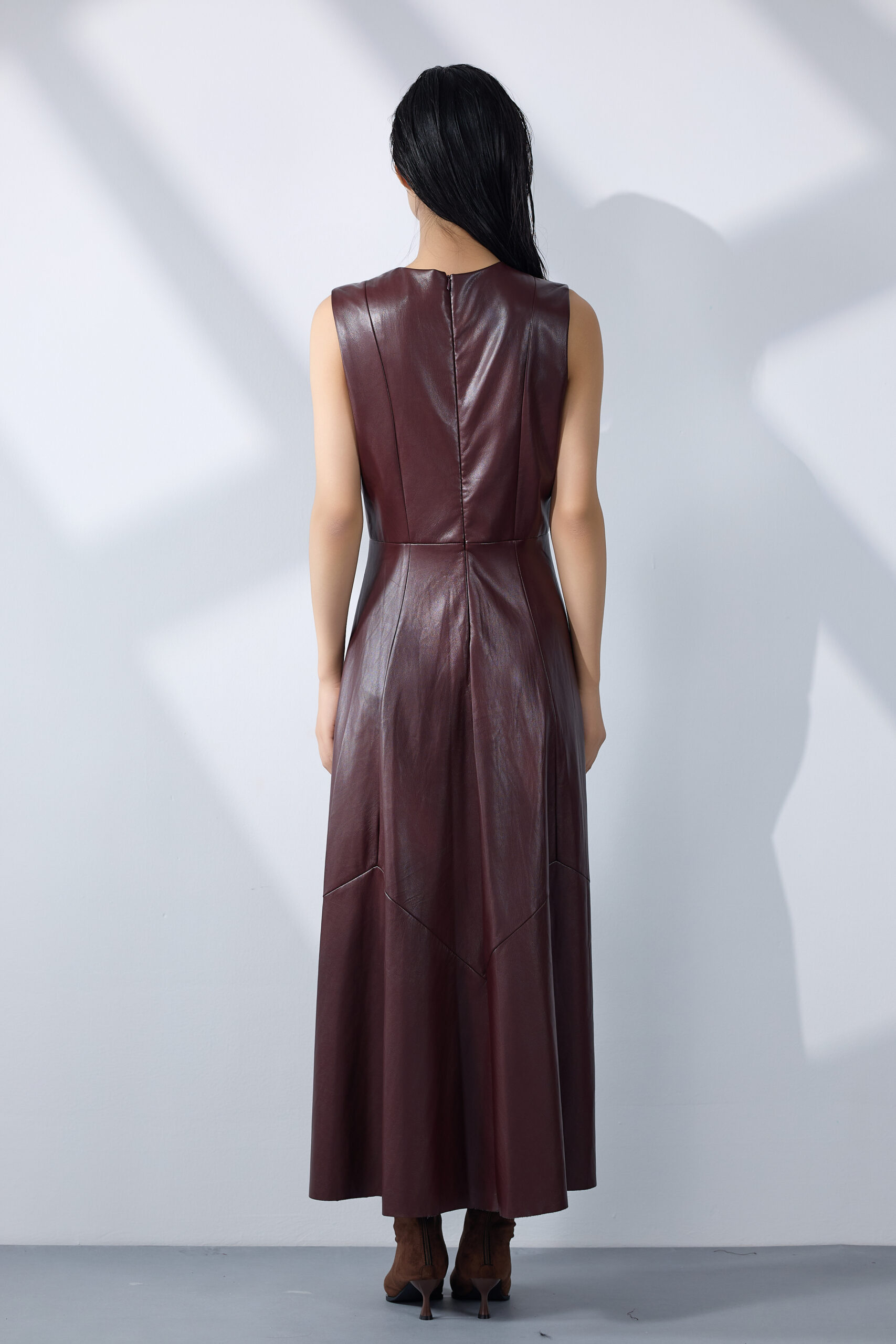 The Arden dress in deep burgundy, crafted from a soft leather-touch fabric that exudes strength and sophistication. A perfect harmony of architectural simplicity and modern femininity, sculpted to flow with graceful precision.