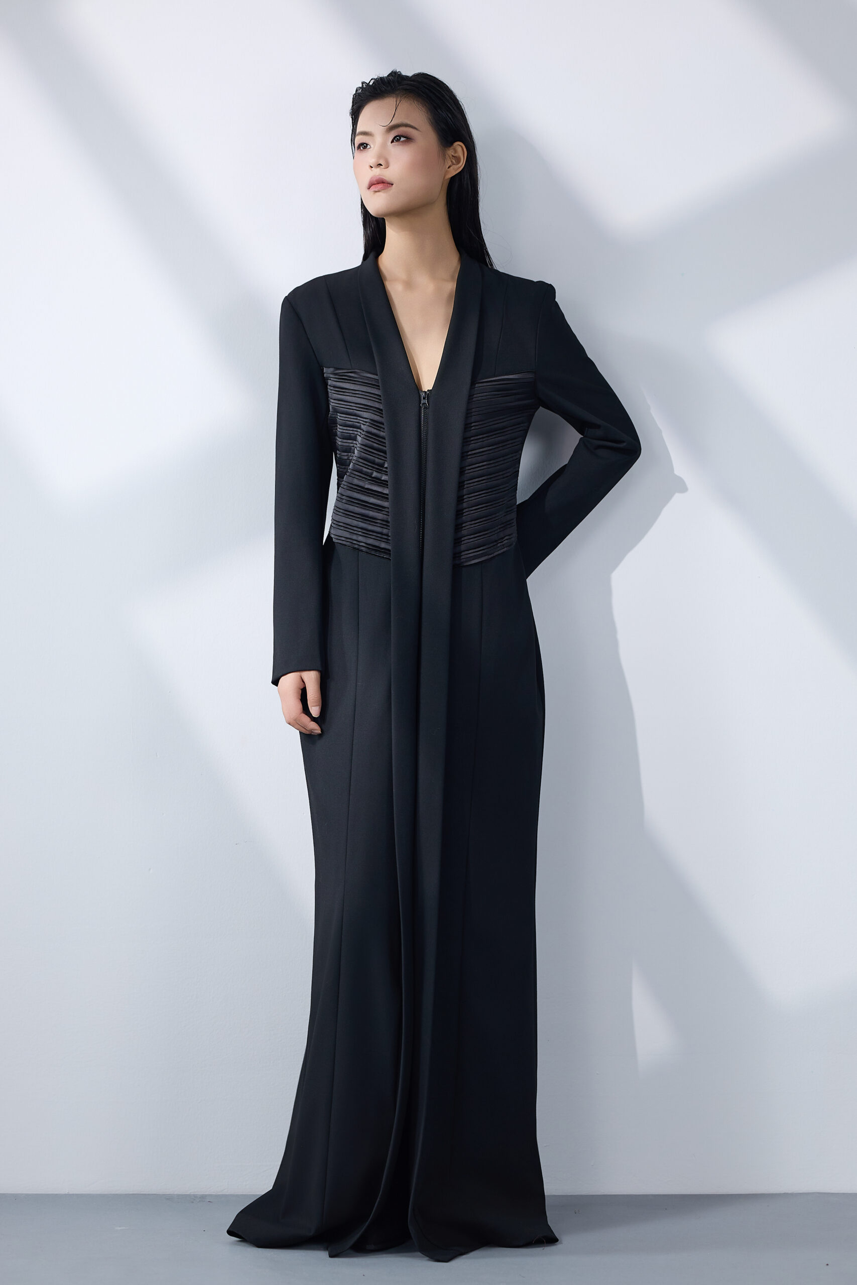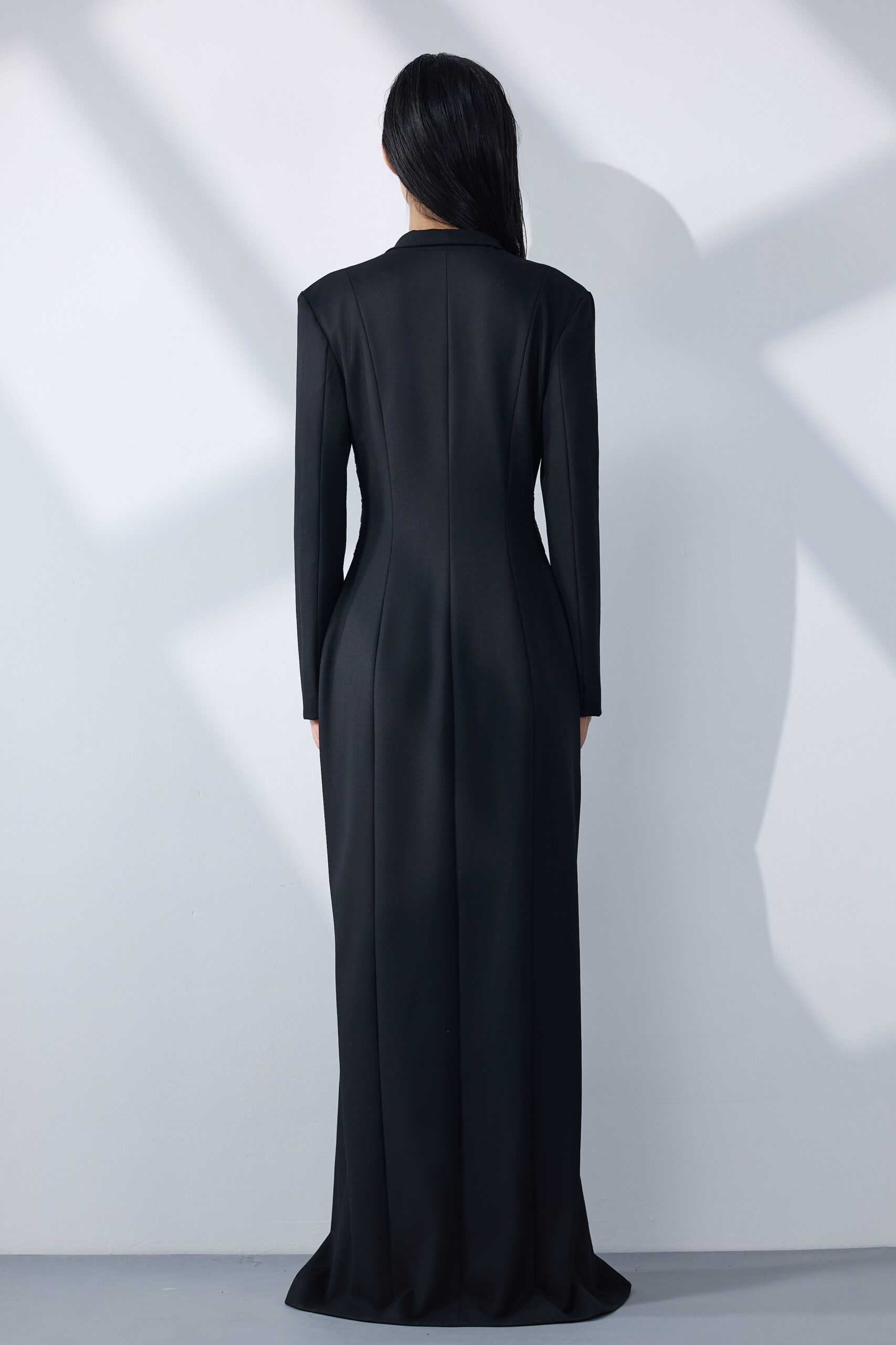 فستان نحتي طويل من قماش القطن الممزوج بخيوط الصوف، بتفاصيل مضلّعة على الخصر وخطوط طولية تبرز القوام برقيّ هادئ.