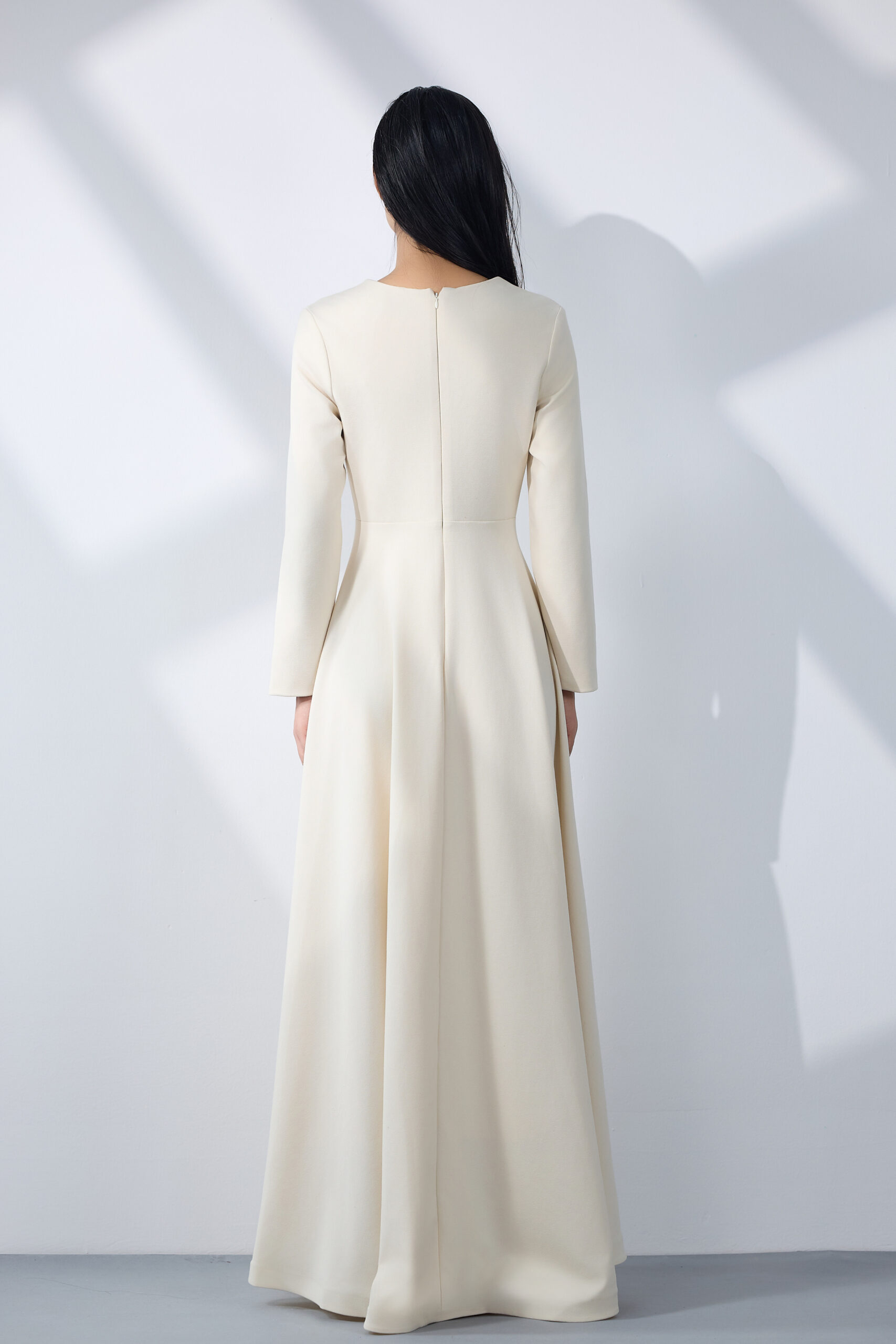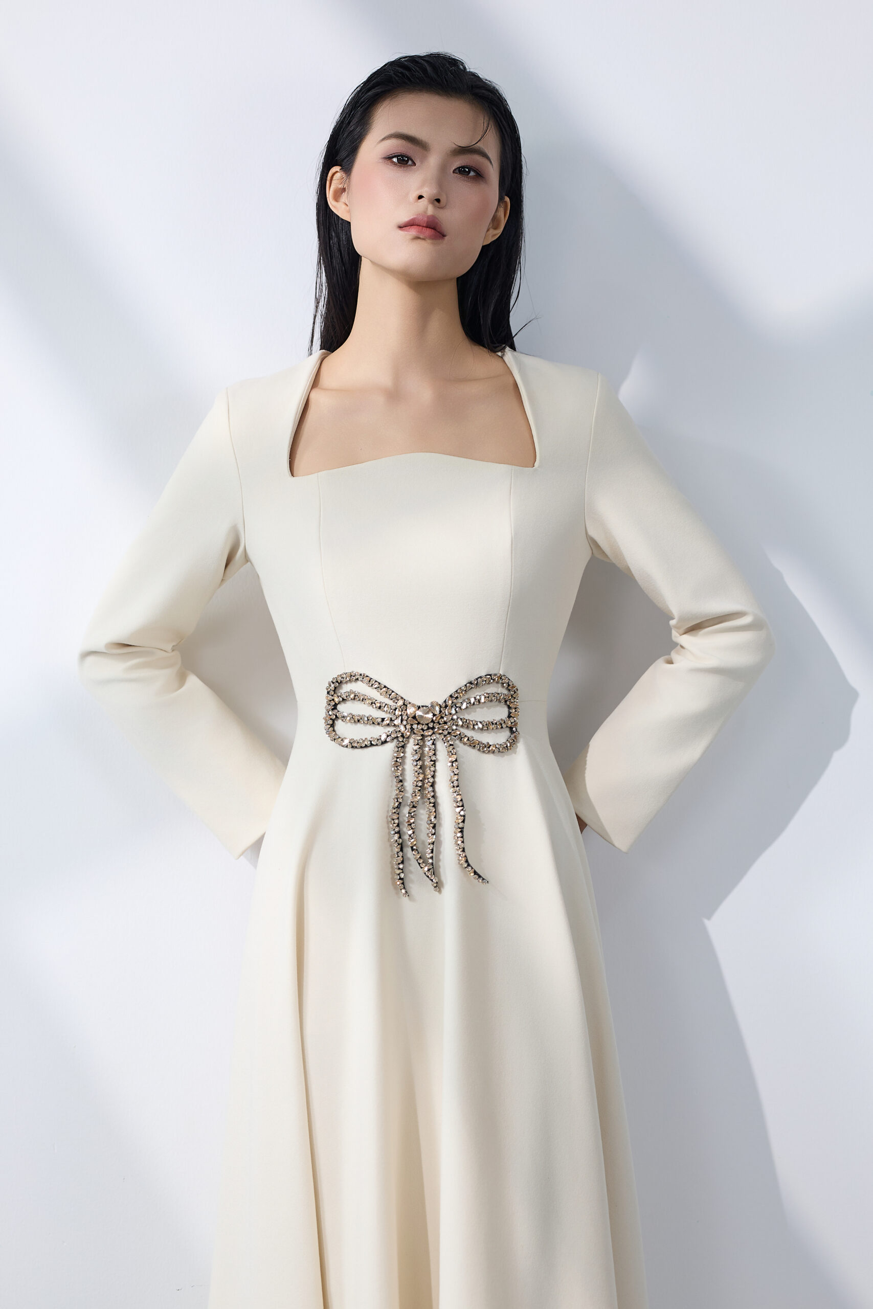 An ivory dress with a refined geometric silhouette, crafted from a cotton-wool blend for a luxurious texture and structured drape. The crystal bow detail adds a timeless feminine radiance.