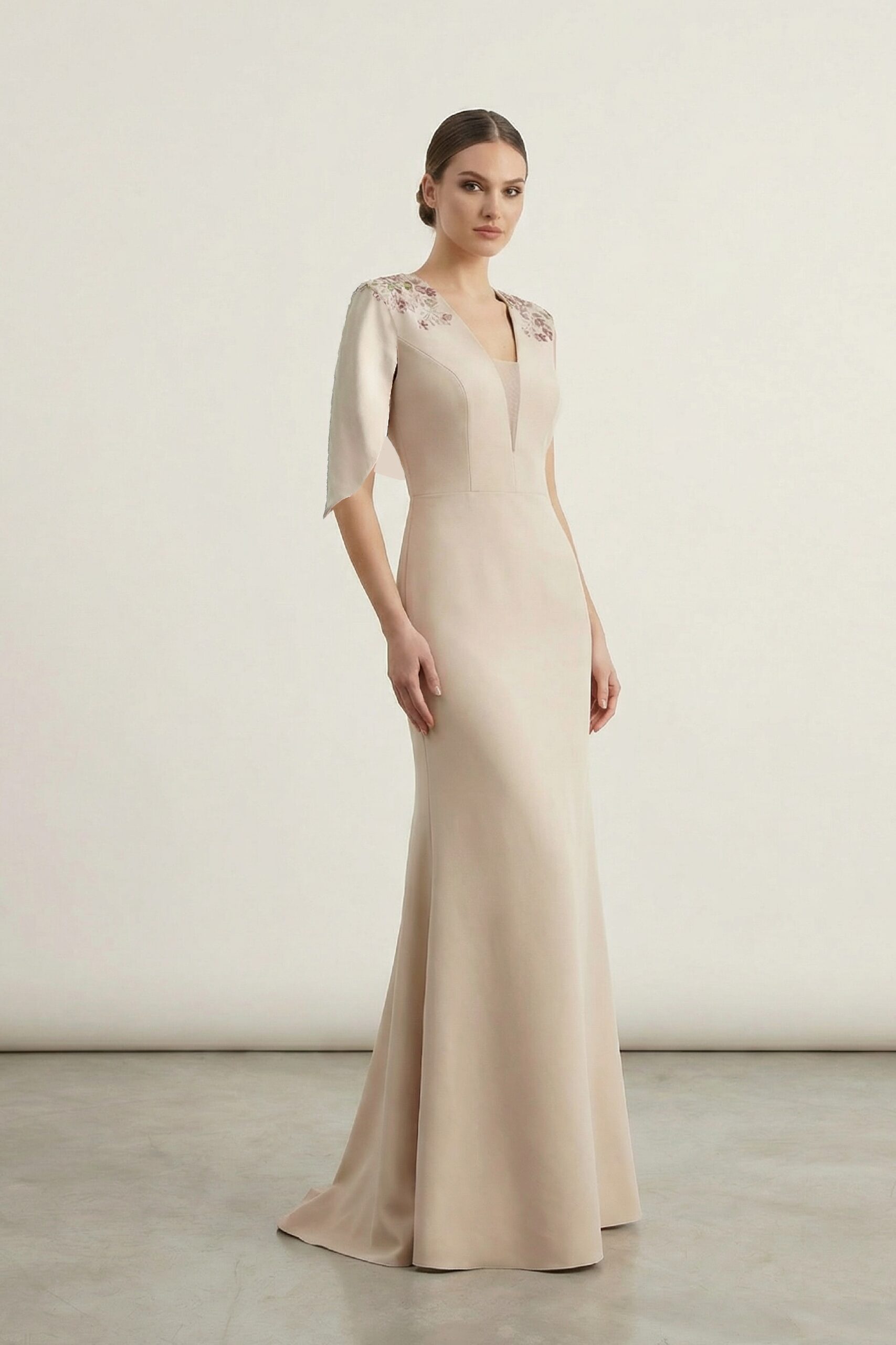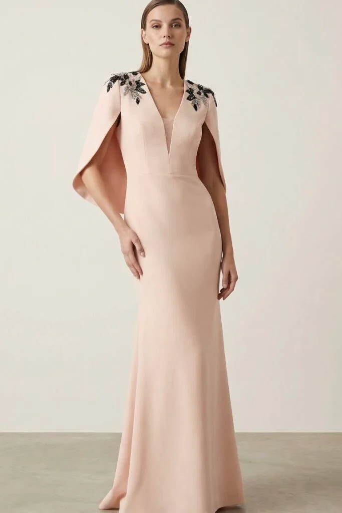 The Élan Crepe Dress is crafted from smooth crepe fabric, featuring a refined long silhouette that reflects effortless elegance. Delicate embroidery along the sleeves and shoulders adds a subtle touch of luxury, making it a perfect choice for refined evening occasions.
