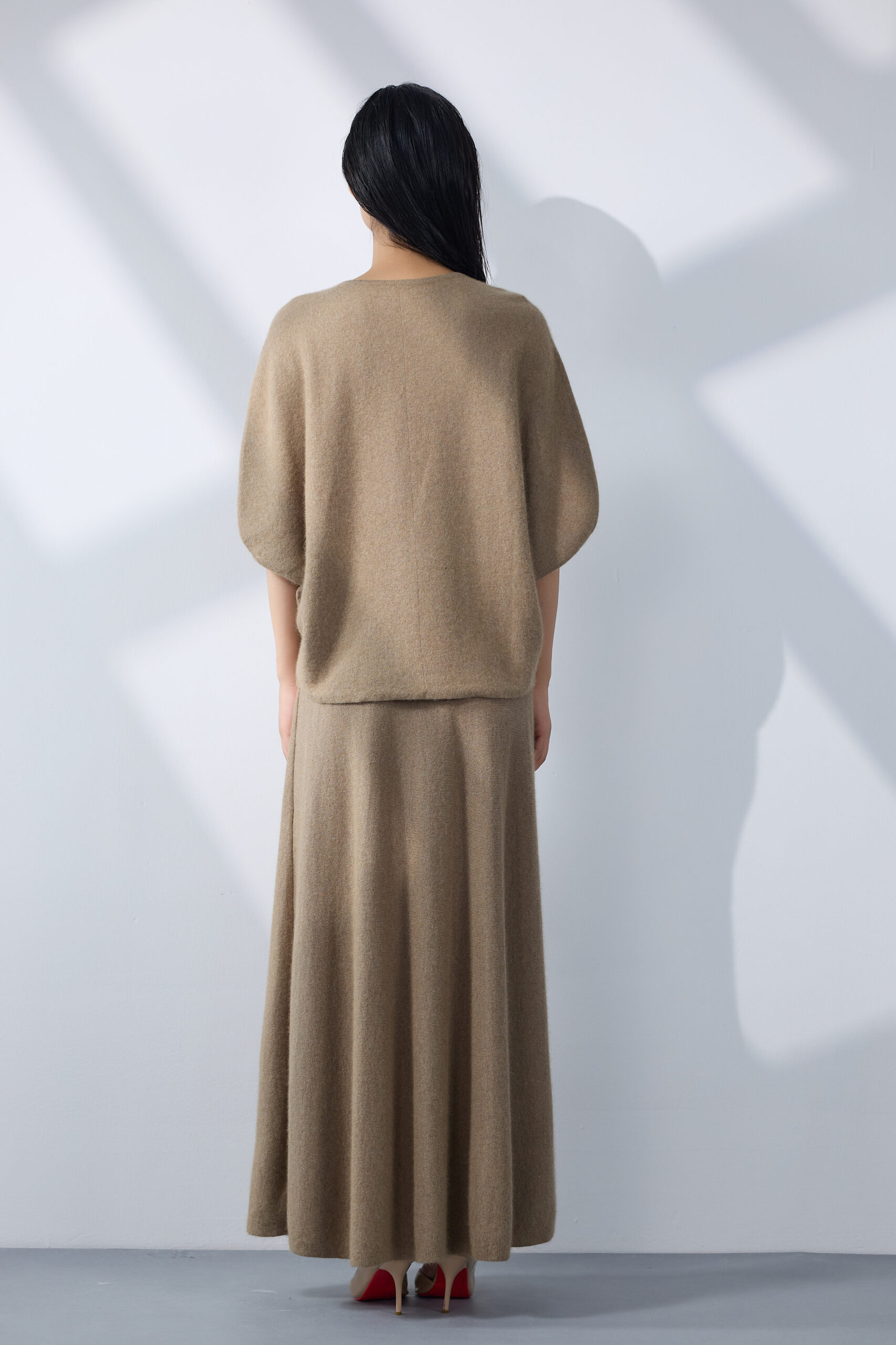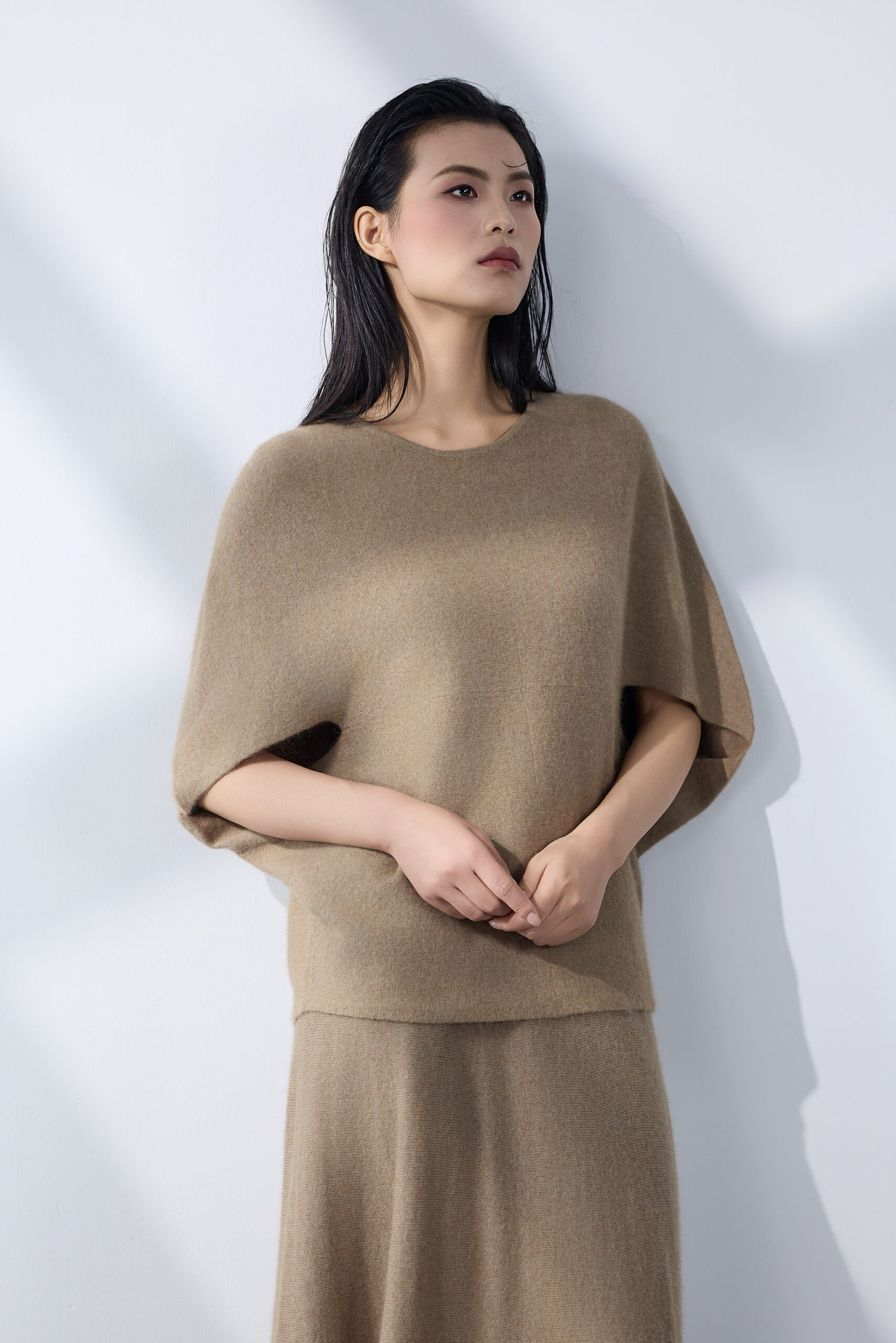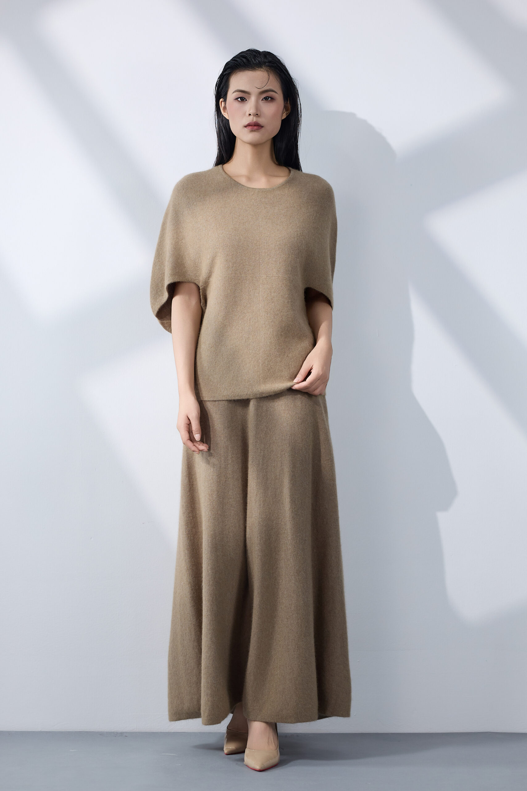 A beige wool-blend set in a fluid, minimalist cut. Élan embodies effortless sophistication — where comfort meets quiet luxury.