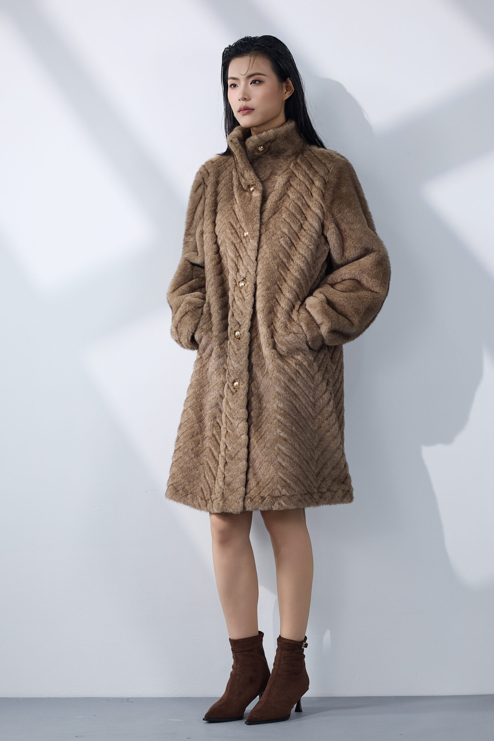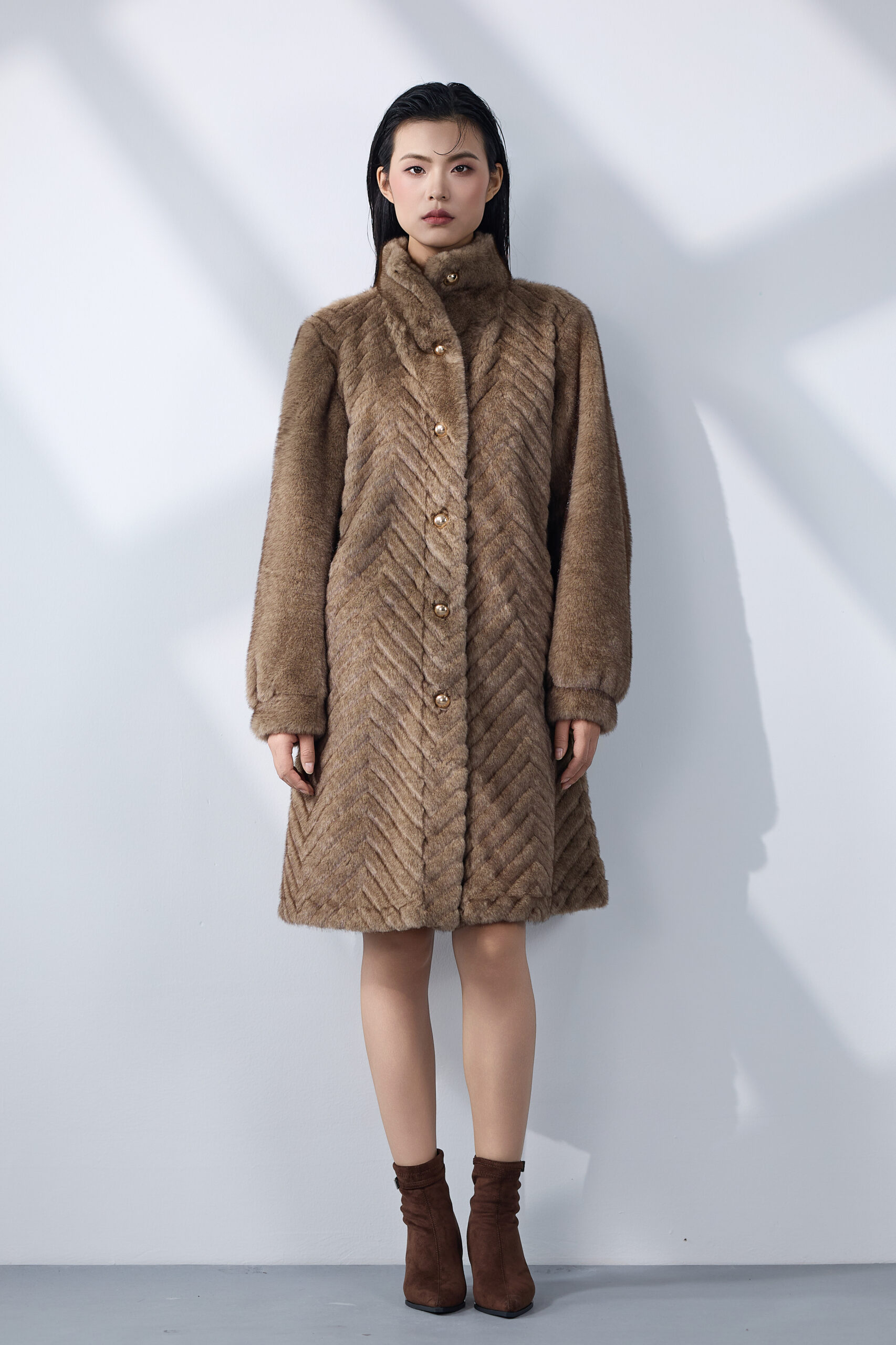 A luxurious ivory winter coat featuring sculpted chevron fur detailing that adds refined geometric texture. Finished with elegant gold buttons for a soft, elevated shine. A straight, polished silhouette that combines warmth, sophistication, and effortless winter elegance
