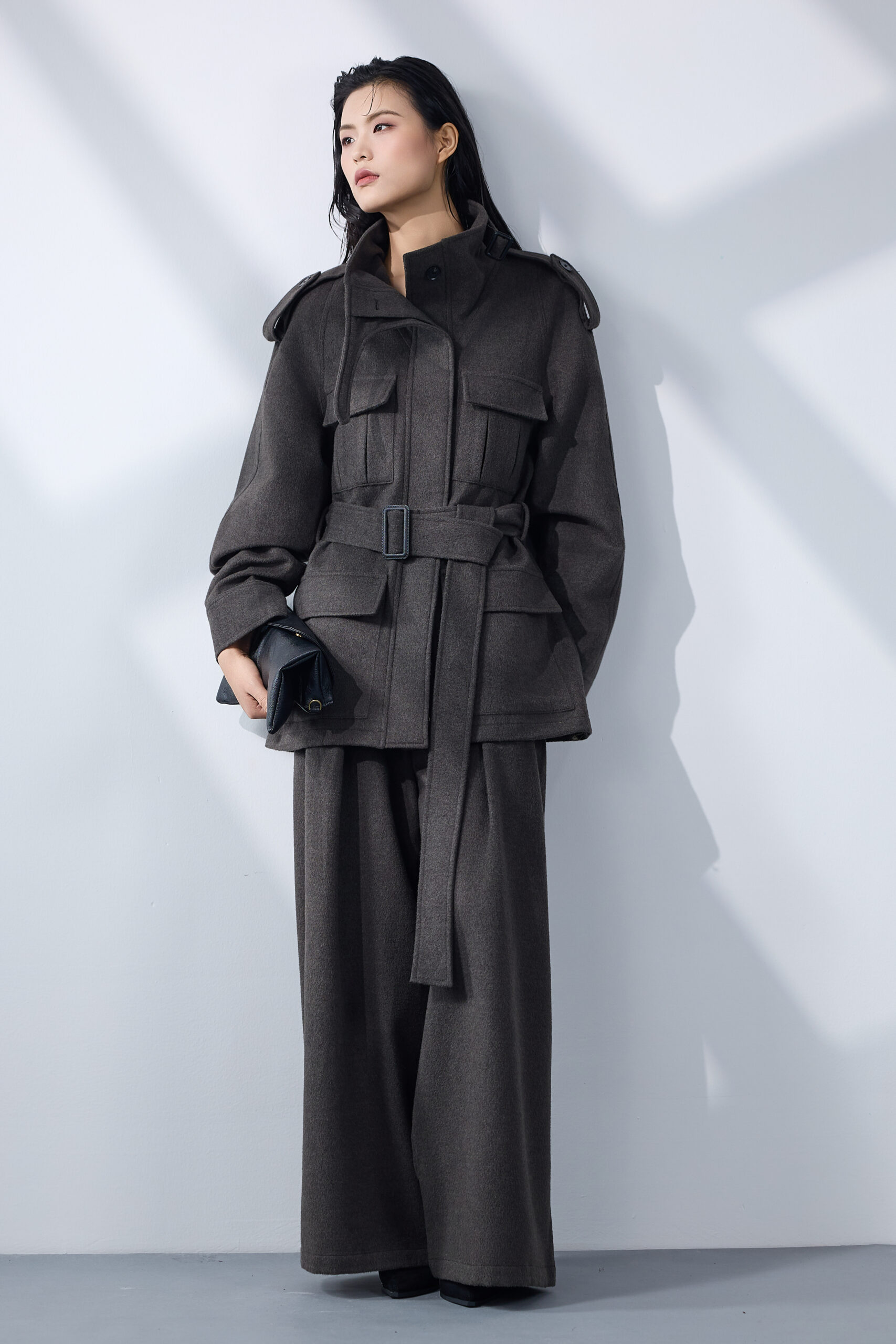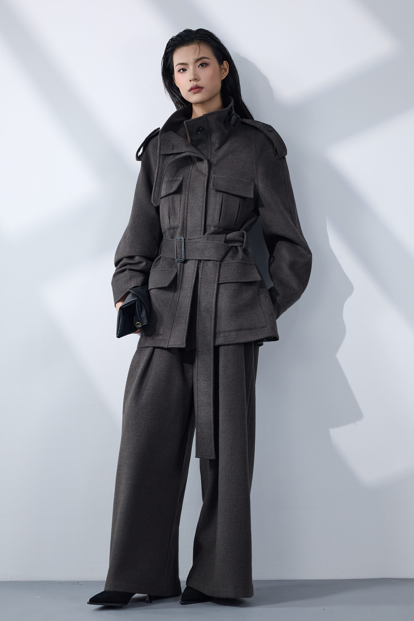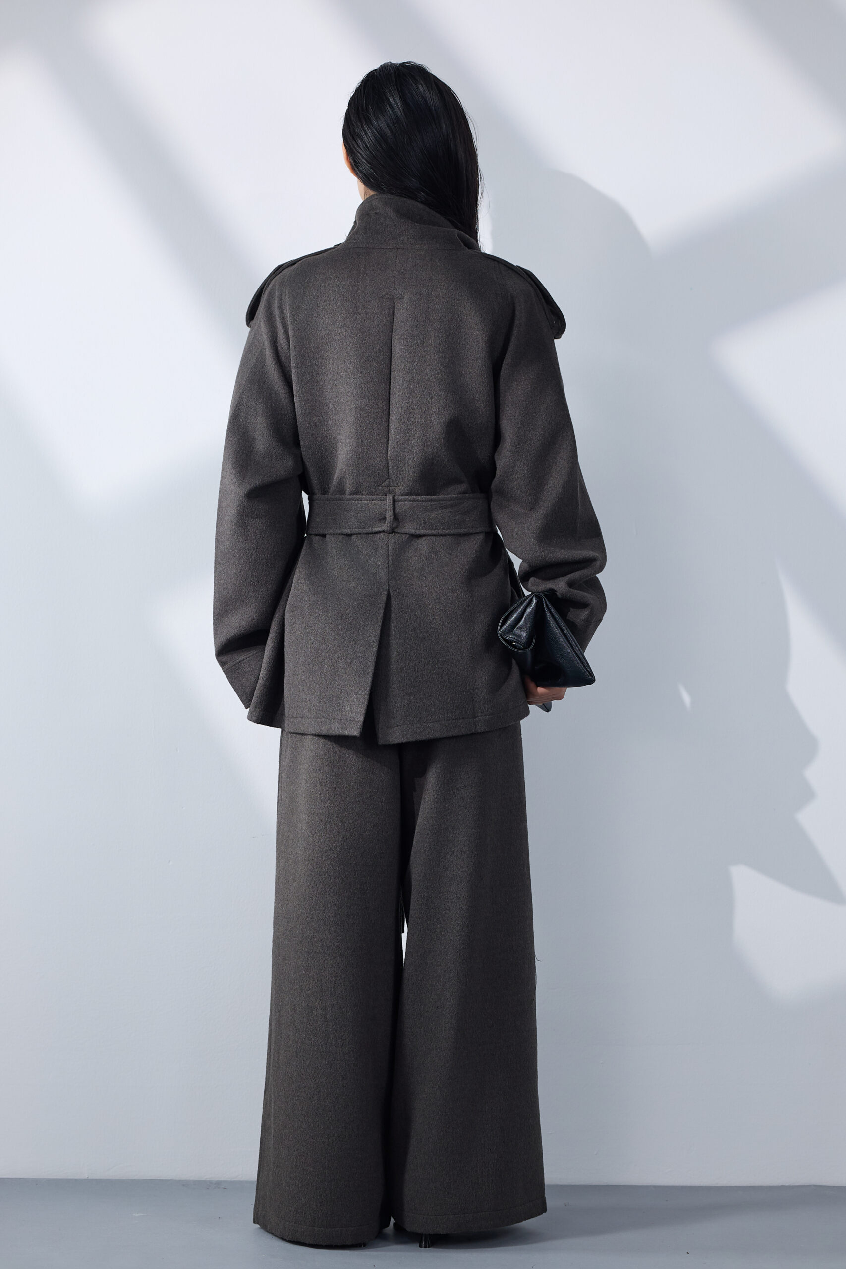 A tailored wool-blend set featuring a belted jacket with soft military lines and wide-leg trousers. Designed for balance — strength in form, grace in movement.